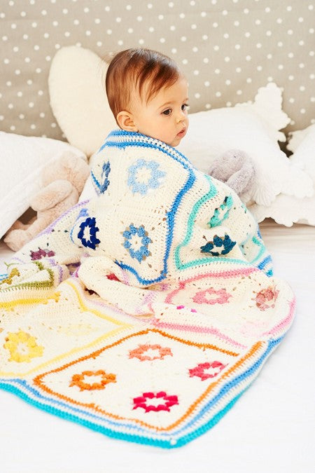 There's a rainbow of colours in this delightful crocheted baby blanket and you can use your leftovers for the stripy bib. Bib in Classique Cott...